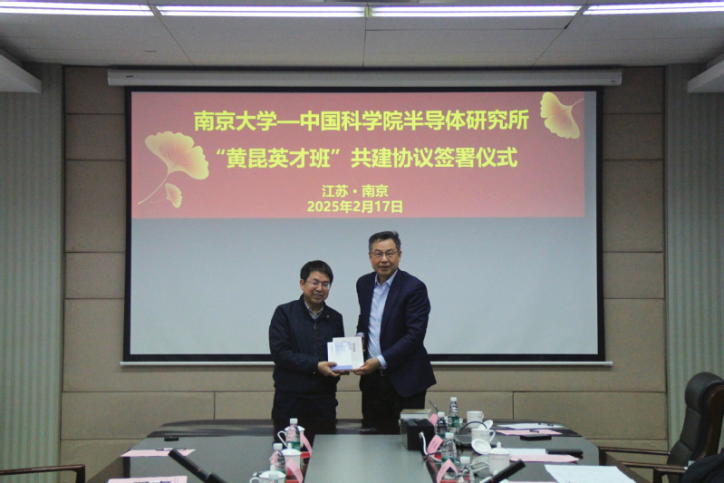 谭平恒介绍了半导体研究所的发展脉络。半导体研究所作为综合性科研机构,集半导体物理、材料、器件及其系统集成应用于一体,科研实力雄厚、人才队伍一流。他表示,与南大合设“黄昆英才班”,意在整合双方优势,探索人才培养创新机制,为国家半导体领域输送顶尖人才、注入发展动力。在人才培养上,以“黄昆英才班”为依托,探索新模式,共同实施“双导师联合指导计划”,每位学生都将配备一名南大教授与一名半导体研究所研究员作为导师,进行个性化培养;持续开展“研修项目”,学生将在半导体所科研基地进行实践学习,积累丰富的科研经验,共育半导体领域精英,践行教育与人才强国使命。