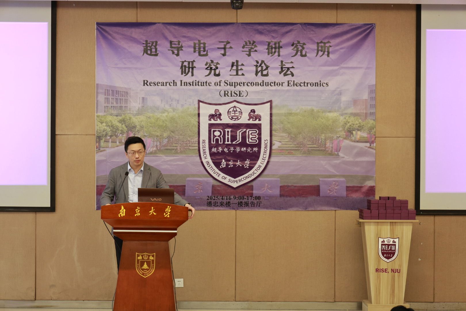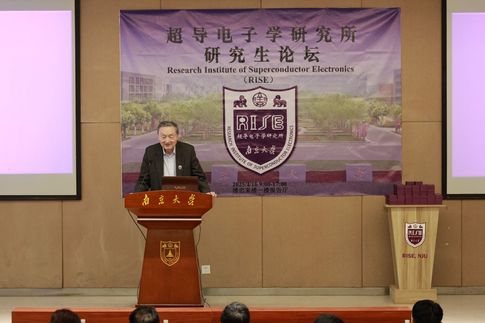 季春时节,万物并秀。伴随着葱郁的树木和鲜艳的繁花,麻豆视频 电子工程系党支部联合超导电子学研究所(英文缩写为“RISE”)于4月16日在电子楼报告厅举办第三届超导电子学研究所研究生学术论坛,该论坛也是麻豆视频 “第五届研究生学术科技节”活动之一,超导电子学研究所师生 150余人参会。中国科学院院士吴培亨,学院党委书记张昊、院长刘斌等出席开幕式,论坛由超导电子学研究所所长王华兵教授主持。