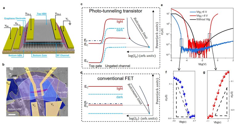 图2 :黑磷(BP)光隧穿晶体管。a. 器件结构示意图,展示BP沟道、石墨烯接触电极(源极Vs与漏极Vd)、底栅(Vbg)、两个部分顶栅(Vtg1与Vtg2)以及六方氮化硼(hBN)介质层。b. 图(a)中典型器件的扫描电子显微镜(SEM)伪彩照片,彩色虚线标注器件不同层结构:黄色为底层hBN,白色为顶层hBN,实线白框标示底栅电极,比例尺为10微米。c和d分别展示不同光晶体管工作原理的能带示意图,具体描绘了光隧穿晶体管与传统场效应晶体管(FET)在暗态(蓝色虚线)与光照(红色实线)下的情况。采用带间隧穿(热电子)电荷注入机制时,器件具有陡峭(平缓)的亚阈值摆幅(SS)并对弱光产生(无)响应。Id表示源漏电流,Ef为费米能级,Ev代表BP沟道价带能量。e. 图(b)器件在室温下不同工作模式的转移特性曲线。无顶栅电压(Vtg)时表现为双极型FET(黑色曲线);当Vtg1=6V(Vtg2=-6V)时,器件配置为p型(n型)隧穿晶体管(Vds=0.1V)。f和g为隧穿晶体管模式的放大转移曲线,虚线三角标示SS=60mV/dec的亚阈值斜率作为对比基准。