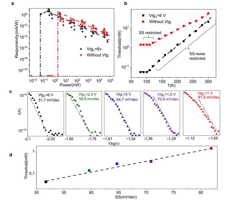 图4 :亚阈值摆幅(SS)与开启阈值的关联性。a. 通过光响应测量提取的传统FET(红色)与光隧穿晶体管(黑色)响应度对比,显示光隧穿晶体管具有更优的阈值功率但响应度较低。b. 实测传统FET(红色)与光隧穿晶体管(黑色)的阈值功率随温度变化关系,曲线可划分为两个特征区域,揭示了电荷注入机制对阈值功率的决定性作用。c. 不同顶栅电压(Vtg1)下器件的转移特性曲线,显示SS随Vtg1连续调控,灰色虚线标示SS=60 mV/dec的参考斜率(Vds=0.1V)。d. 对应(c)中配置的实测阈值功率与SS的函数关系。