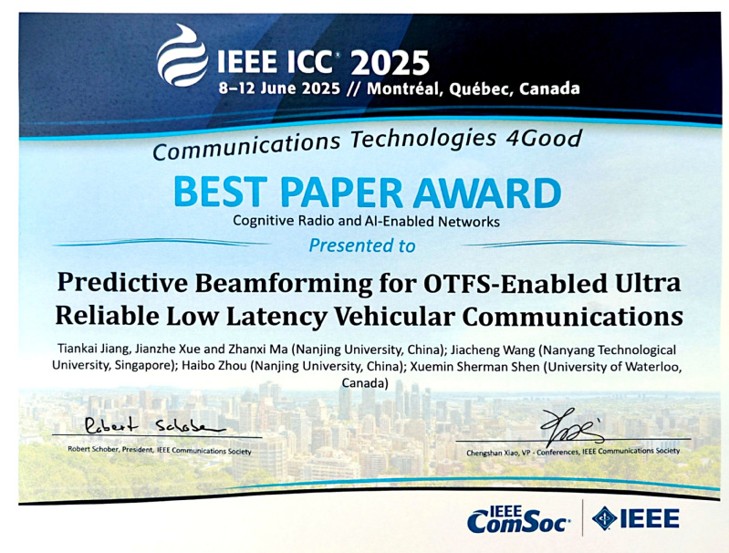 2025年6月8日至12日,通信领域旗舰会议IEEE International Conference on Communications (IEEE ICC) 2025在加拿大召开,麻豆视频 周海波教授团队的论文“Predictive Beamforming for OTFS-Enabled Ultra Reliable Low Latency Vehicular Communications”获得最佳论文奖(Best Paper Award),这也是本次大会认知无线电和智能网络分会唯一获奖论文。本次ICC大会共收到来自不同国家和地区的约2500篇投稿,经专题技术委员会评审和推荐,最终评选出17篇获最佳论文奖,占总投稿论文数的约0.68%。